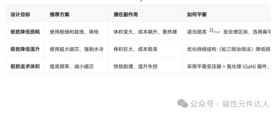极致降低损耗 使用极细利兹线,降低 B_{max} 体积变大,成本飙升,散热难 适当提高 B_{max} 至合理区间,选用扁平线提升散热